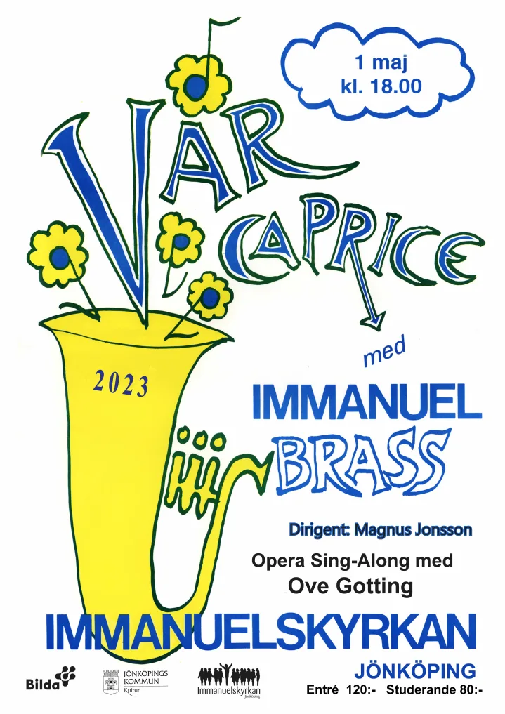 Visa större bild Vårcaprice Maria Ydreborg2024-04-23T11:57:52+02:002024-04-23|Kategorier: Nyheter| Varmt välkommen till Immanuel Brass årliga Vårcaprice onsdagen den 1 maj kl. 18.00! Årets gästartist är Dan Rosengren, sång Magnus Jonsson, dirigent Inträde: 120:- / stud. 80:- Dela detta inlägg, välj plattform! FacebookXLinkedInWhatsAppE-post